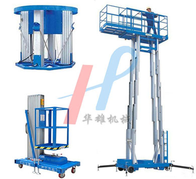 單桅鋁合金升降機(jī)是由單桅柱支撐作業(yè)平臺(tái),是起初出現(xiàn)的鋁合金升降機(jī)。具有升降平衡,操作方便等優(yōu)點(diǎn)能,可隨意進(jìn)出電梯且耗電少、無(wú)污染、工作時(shí)不傷 地面,可用于貼墻工作及探出作業(yè),工作無(wú)死角等優(yōu)點(diǎn)。雙桅鋁合金升降機(jī)整體采用高強(qiáng)度鋁型材精制而成由于型材強(qiáng)度高,使升降臺(tái)的偏轉(zhuǎn)與擺動(dòng)極小。采用雙桅柱式結(jié)構(gòu),載重量大,平臺(tái)面積大,穩(wěn)定性極好,運(yùn)轉(zhuǎn)靈活,推行方便。 三桅鋁合金升降機(jī)由三組桅柱支撐作業(yè)平臺(tái)同步升降,支腿結(jié)構(gòu)同單桅柱式平臺(tái),具有超大的載重量和優(yōu)秀的工作穩(wěn)定性。四桅鋁合金升降機(jī)整體采用高強(qiáng)度鋁型材精制而成由于型材強(qiáng)度高,采用四桅柱式結(jié)構(gòu),穩(wěn)定性極好,運(yùn)轉(zhuǎn)靈活,載重量大,平臺(tái)面積大,推行更方便。